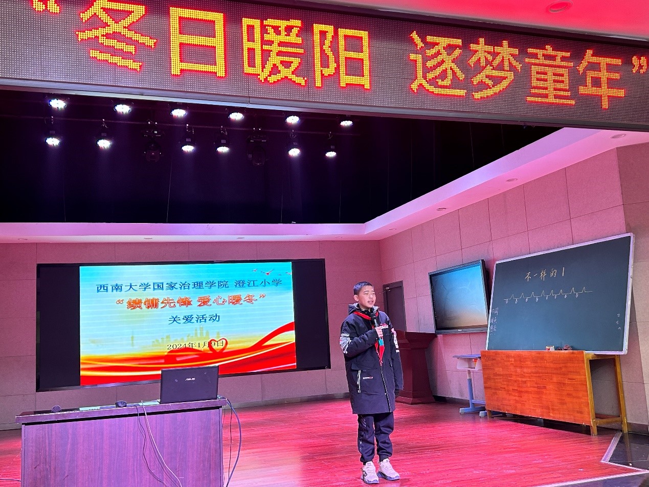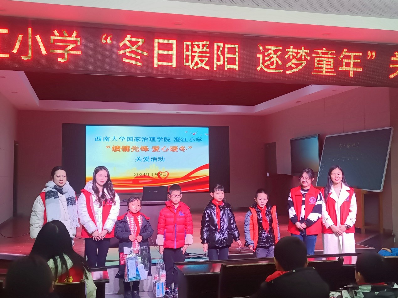 1月8日上午,国家治理学院绩镛先锋“澄风破浪”实践队来到澄江镇小学校,开展“绩镛先锋 爱心暖冬”关爱进校园活动。参与此次爱心传递活动的15名小朋友,均为城市低保、农村低保、脱贫家庭、残疾学生等困难群体。寒假社会实践队成员精心准备了爱心文具礼包,并为每一位小朋友手写了温情祝福卡片,激励他们将自己的努力拼搏化为成功的翅膀,勇往直前,展翅翱翔!
