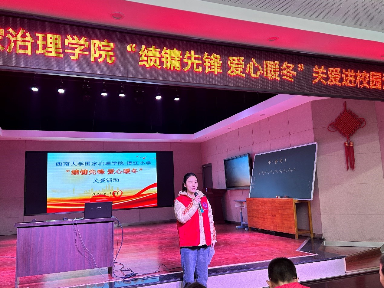 为深入学习贯彻习近平新时代中国特色社会主义思想,全面落实党的二十大精神,引导研究生学子积极投身助力乡村教育行动,国家治理学院绩镛先锋“澄风破浪”实践队充分发挥专业优势,于1月8日至10日前往北碚澄江镇小学校,以“关爱乡村困境儿童健康”为主题开展寒假社会实践活动。