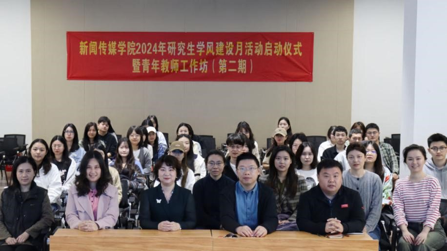 为深入学习贯彻习近平新时代中国特色社会主义思想,全面落实党的二十大精神、全国研究生教育会议精神,促进学院学风建设与青年教师成长的双向赋能,4月12日上午,新闻传媒学院2024年研究生学风建设月活动启动仪式暨青年教师工作坊(第二期)活动正式拉开序幕。学院党委书记严怡、院长龙伟、副院长秦红雨出席活动,研究生导师代表、青年教师代表范雨竹、顾恩澍、林丽,研究生辅导员易安琪,以及2022级、2023级全体硕博研究生参会。严怡书记主持启动仪式。
