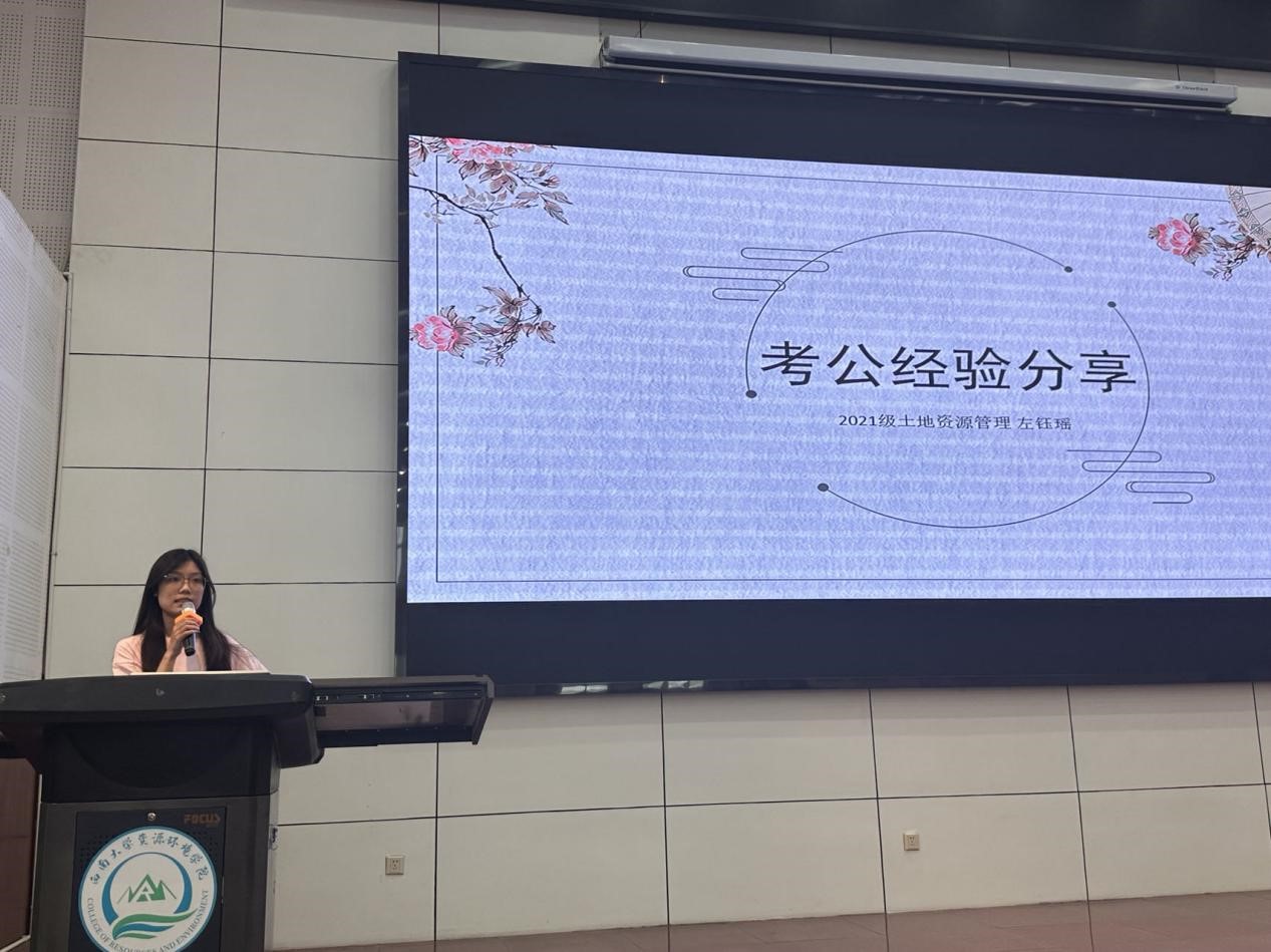 2021级林学专业研究生宋兰同学从选调生考试的概述、个人考试时间规划、各环节的备考策略以及经验与心得分享展开介绍。她向同学们提供了四条建议,首先,尽早明确就业方向,结合个人兴趣、优势、地域偏好和专业背景,评估是否适合公务员等职业。其次,积极探索信息渠道,及时获取招录信息。再者,善于抓住机会,广泛尝试相关领域的考试和职位,通过实践积累经验。最后,要保持平常心,就业渠道不唯一,人生充满各种可能性。