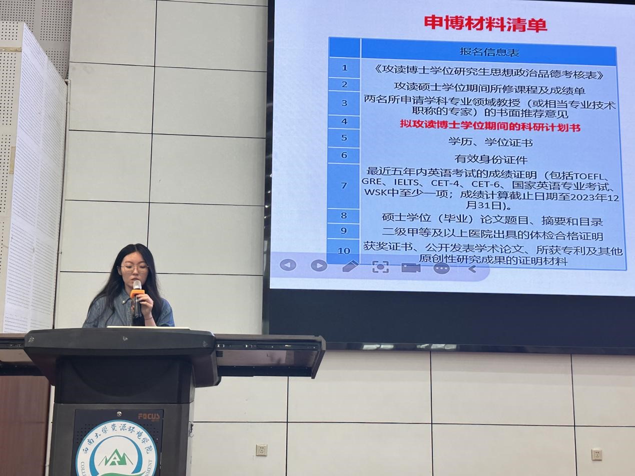2021级农业资源与环境专业研究生郝尚妍同学结合自己成功申请博士的经历,为同学们开展了详细的介绍。她聚焦申博流程及其重要时间节点,提醒大家申请博士需要提前规划,尤其是关注各个学校的截止日期和所需材料的准备时间。建议同学们制定详尽的时间表,从准备标准化考试到推荐信和个人陈述的撰写,每一项都至关重要,并提醒同学们在申请前要反复检查这些材料,确保无误且符合申请要求。