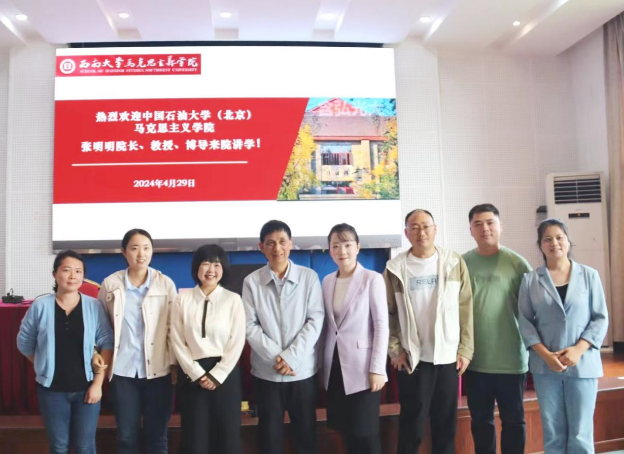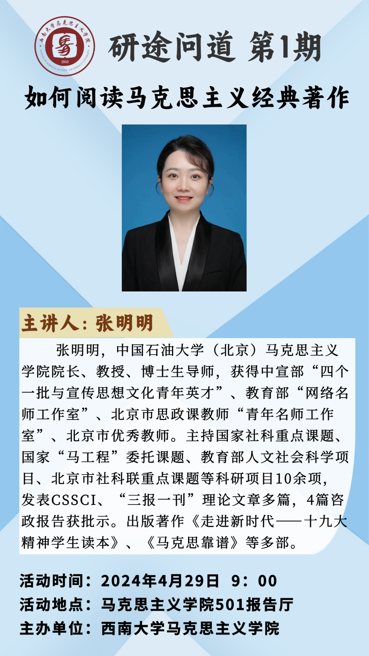 为贯彻落实习近平总书记关于学习马克思主义的重要论述,帮助马克思主义理论研究生提高学术与科研能力,助力研究生培养工作提质增效,4月29日上午,马克思主义学院在501报告厅成功开展第一期“研途问道”活动。本次活动邀请到中国石油大学马克思主义学院院长张明明教授做“如何阅读马克思主义经典著作”的主题分享,马克思主义学院党委副书记、纪委书记曾艳,马克思主义学院罗洪铁教授出席本次活动,学院各年级研究生参与活动。活动由马克思主义学院副院长靳玉军主持。