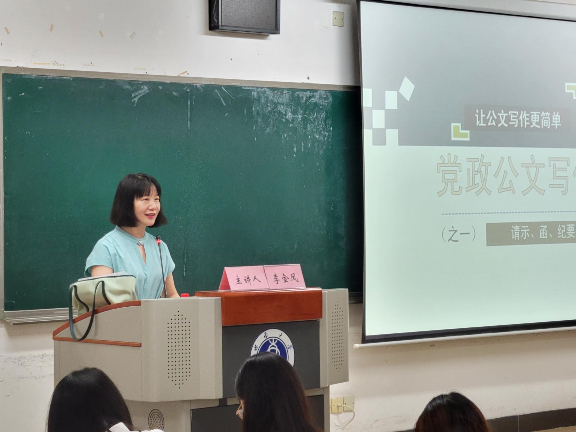 开营仪式后,李金凤老师讲授“党政机关公文写作(一)——报请类、商洽类、纪要类等公文”课程。李金凤老师主要详细介绍了“请示”“函”以及“纪要”三种公文的含义、特点、写法以及注意事项。除此之外,她还介绍了学习公文写作的方法及相关学习资料的查阅方式。第一讲课程节奏快但“干货满满”,李老师将知识点与实际案例和真题相结合,在循循善诱中指导各位学员掌握了如换位思考、突出重点、表述客观具体等相关知识点,并手把手带着同学们进行公文写作的实战演练。学员们也积极参与问答,整堂课堂气氛轻松融洽。