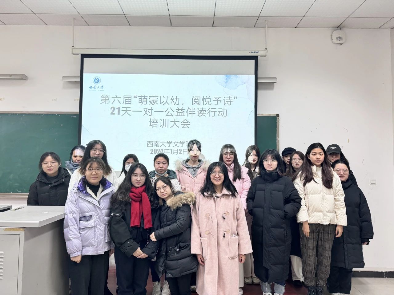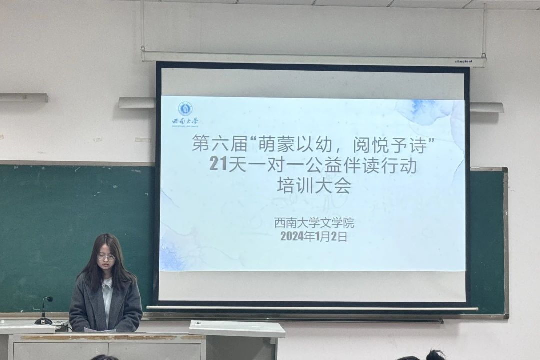 1月2日,第六届“萌蒙以幼·阅悦予诗”21天一对一公益伴读行动培训活动在文学院111教室举办。研究生辅导员凌飞老师出席活动,18名伴读行动志愿者参加。活动由2023级现当代文学专业研究生刘雨佳主持。