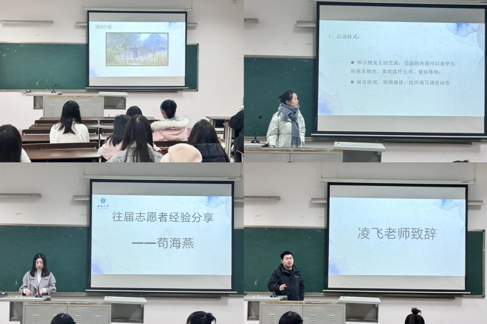 首先,志愿者们观看了往届活动风采展示视频,对公益伴读行动的内容与主旨进行深入了解。接下来,第五届伴读活动优秀志愿者张小梅、苟海燕进行经验分享。她们结合自身经历,分别从伴读流程、书目选择、沟通协商方式、心态保持等多个方面与志愿者们展开交流,并强调了引发孩子阅读兴趣、培养其良好阅读习惯的重要性。之后,就业拓展部相帅英围绕活动流程及相关注意事项进行了详细讲解。最后,研究生辅导员凌飞老师对本次伴读行动的要点进行补充。他介绍了本次活动所帮扶小学的概况,帮助志愿者们结合实际情况制定伴读策略。他更强调了本次活动的意义,伴读行动不仅是一次社会实践,更是一项育人工程,他希望志愿者们能将该意义更好地落实在具体行动中。最后,他表达了对本次活动顺利进行的衷心祝愿。
