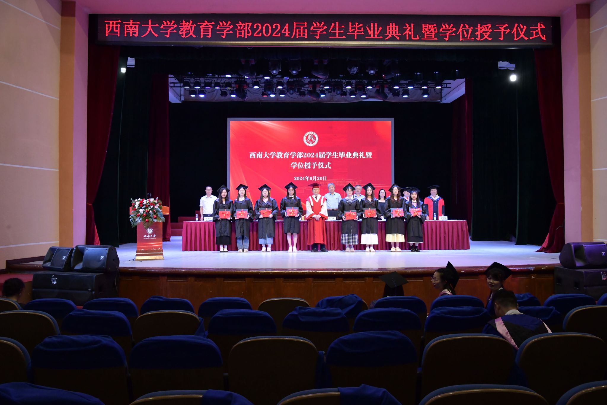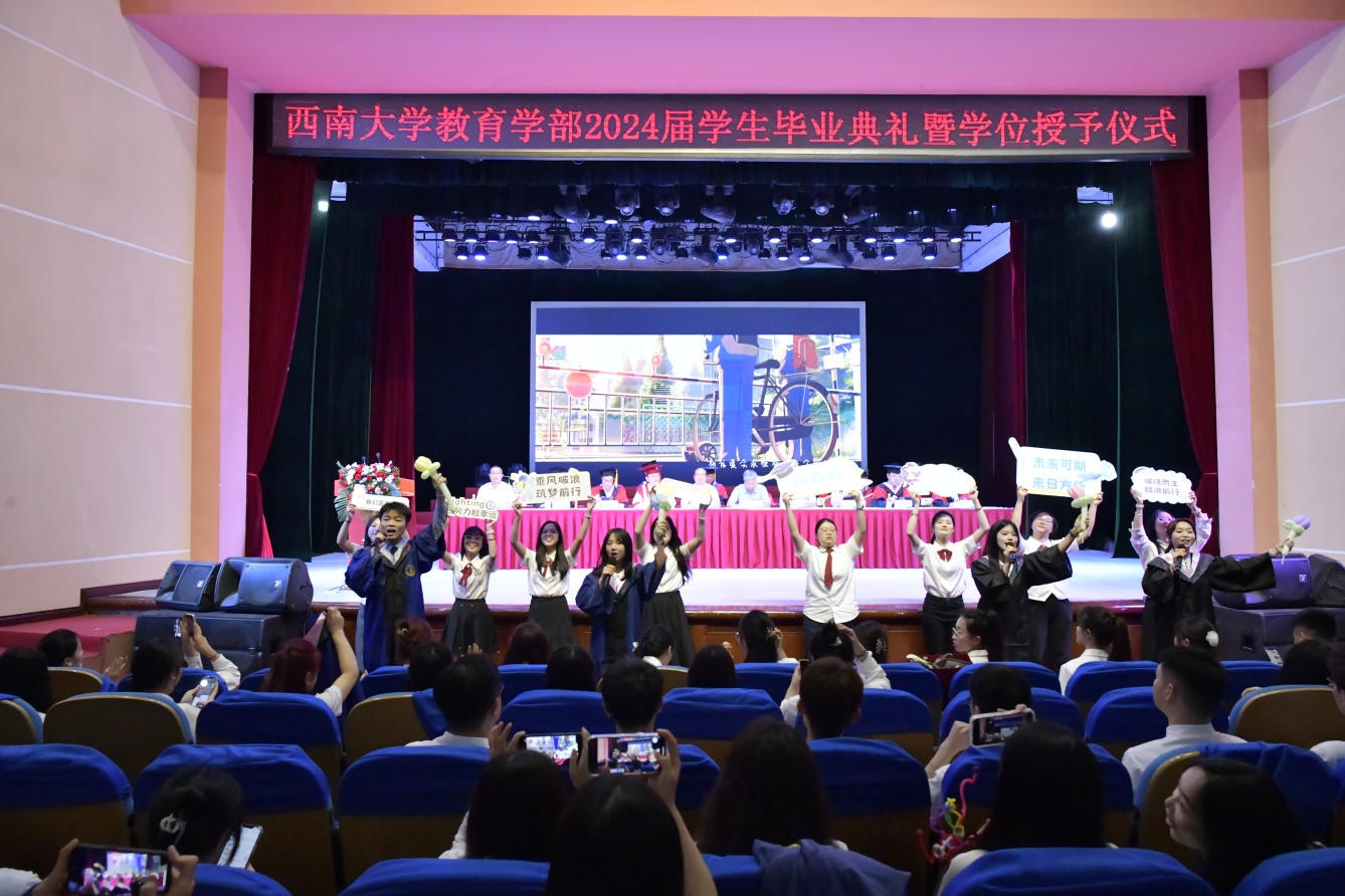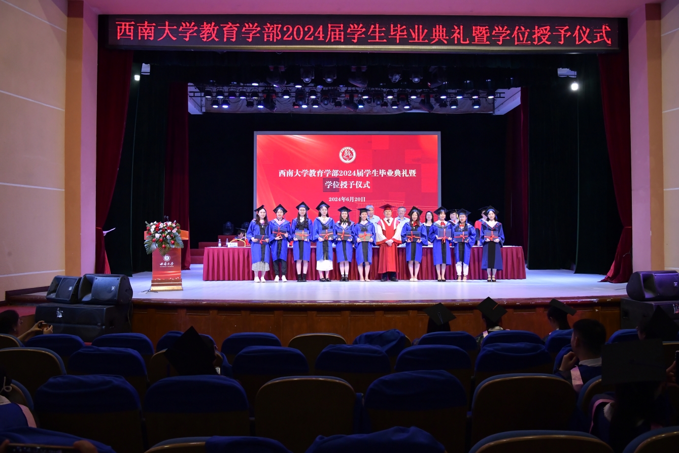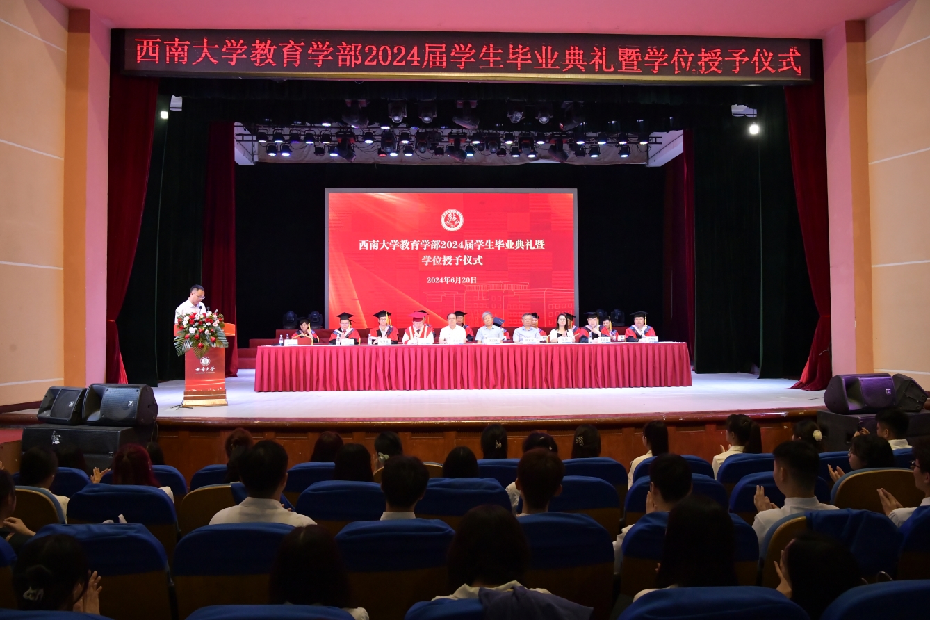 6月20日下午,教育学部2024届学生毕业典礼暨授位仪式在光大礼堂隆重举行。学校党委常委、副校长周光明教授,原常务副校长、原西南师范大学校长宋乃庆教授,学部全体党政领导和学位委员会委员、各学院负责人,教师、亲属代表和2024届全体毕业生出席活动,学部党委副书记、纪委书记卓玉兵主持典礼和仪式。
