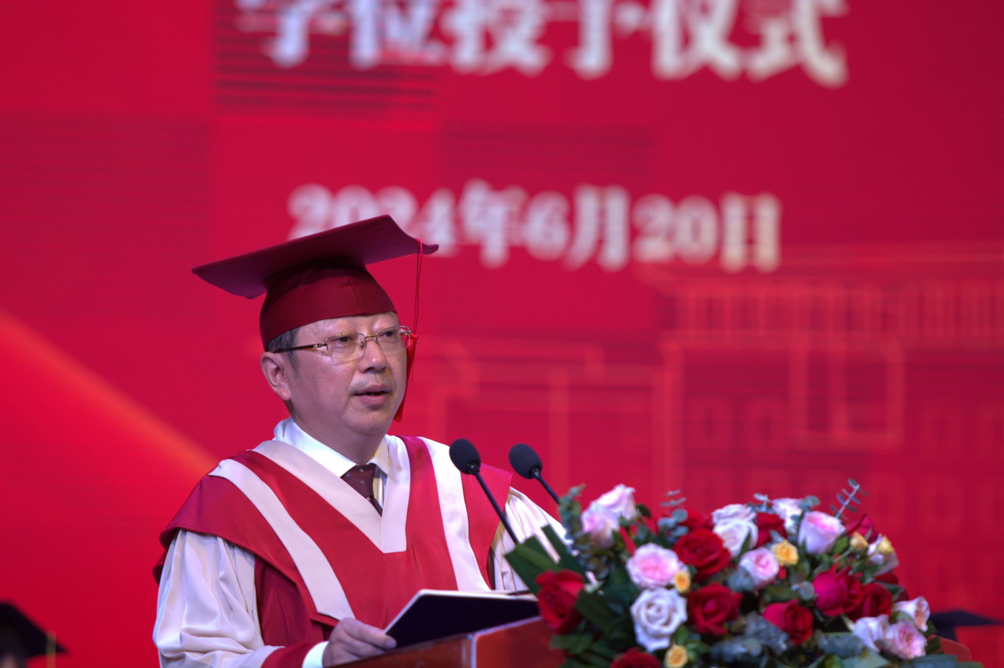 学部党委书记周文全宣读了2024届学生表彰决定、毕业决定和学位授予决定。在主席台前排就座的领导为获得表彰的代表颁发荣誉证书,为毕业生颁发毕业证书、学位证书。学部学位评定委员会主席、部长朱德全教授为学位获得者授位。