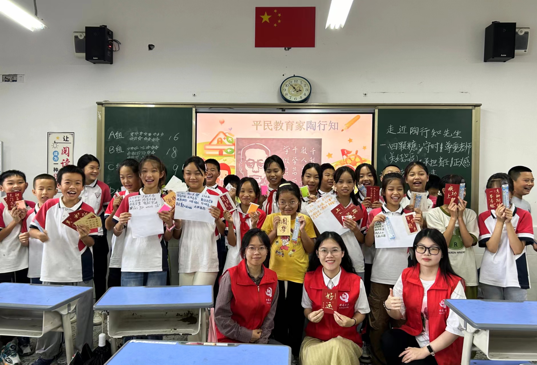 如何让小学生们对以陶行知先生为代表的教育家精神深入理解?教师教育学院研究生为育才学校五、六年级学生开展以“陶行知与教育家精神”为主题的特色课程,共同走进教学合一、寓教于乐的思想天地:语文课程以“走近陶行知先生 领悟教学做合一”为主题,将陶行知的重要事迹、成长经历、教育背景及经典教育思想娓娓道来;政治课程以“从做中学:热爱劳动,积极实践”为主题,从社会、学校、班级三个层面引导学生感悟劳动力量,树立崇尚劳动、尊重劳动的美好品质;信息技术课程以“陶行知的行与知:谁是海报制作小能手”为主题,分享陶行知生平海报的制作技巧,让学生沉浸式体验“生活即教育”的动手实践。孩子们听得津津有味,纷纷表示,要发扬行知精神,做好“小先生”。