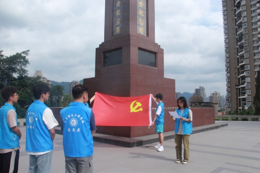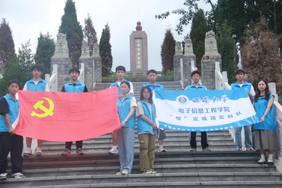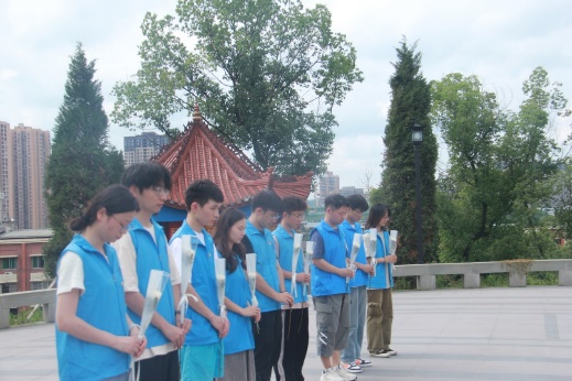 7月1日下午,实践队来到璧山区璧城镇凤凰山上的烈士陵园。该陵园建于1955年,占地约17.52亩,安葬了118位革命烈士。革命烈士纪念碑矗立在凤凰山顶,碑文记载了自解放战争以来,为社会主义革命和建设英勇献身的解放军指战员、农民武装积极分子、人民警察、政府机关干部和学生等烈士的光辉事迹。