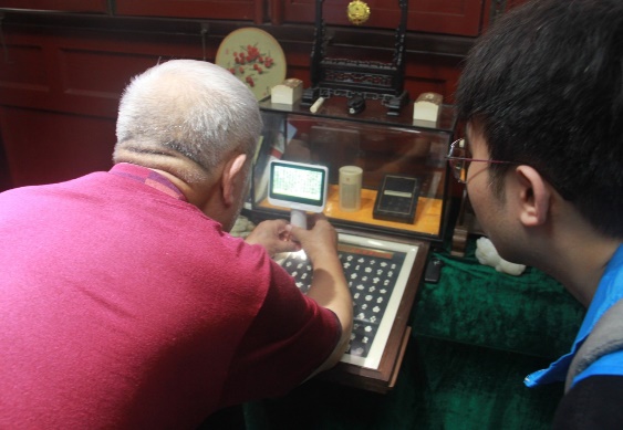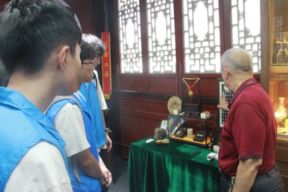 接着,实践队员们拜访了中国十大微雕艺术家之一——潘启慧。潘老先生曾获得四川省工艺美术大师和重庆市十大民间艺术家等荣誉称号。他从八十年代初开始研习微刻技艺,经过近三十年的钻研,其微刻书画已达到了世界一流水平。