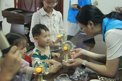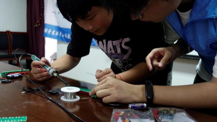 图16:实践队员高埕铭正在教小朋友使用焊枪