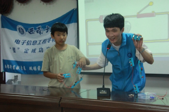 图13:实践队员徐俊杰正在给小朋友讲解串并联电路
