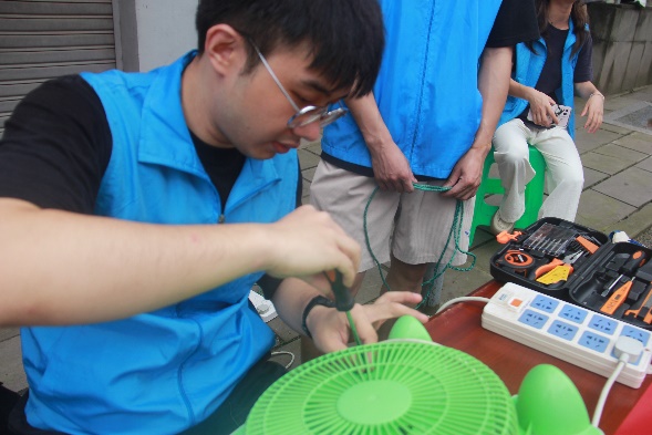 与此同时,由叶治成和高埕铭等数名实践队员组成的志愿服务小队在镇上开展了家电维修志愿服务活动。他们为居民们免费修理各类家电,从风扇到空调,无所不修,用专业技能和热情服务解决居民们的实际困难。
