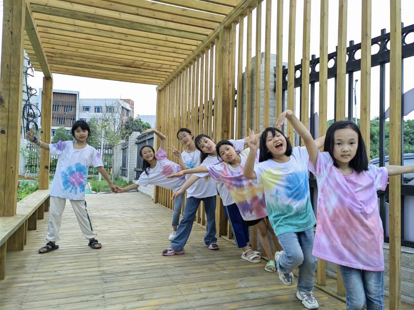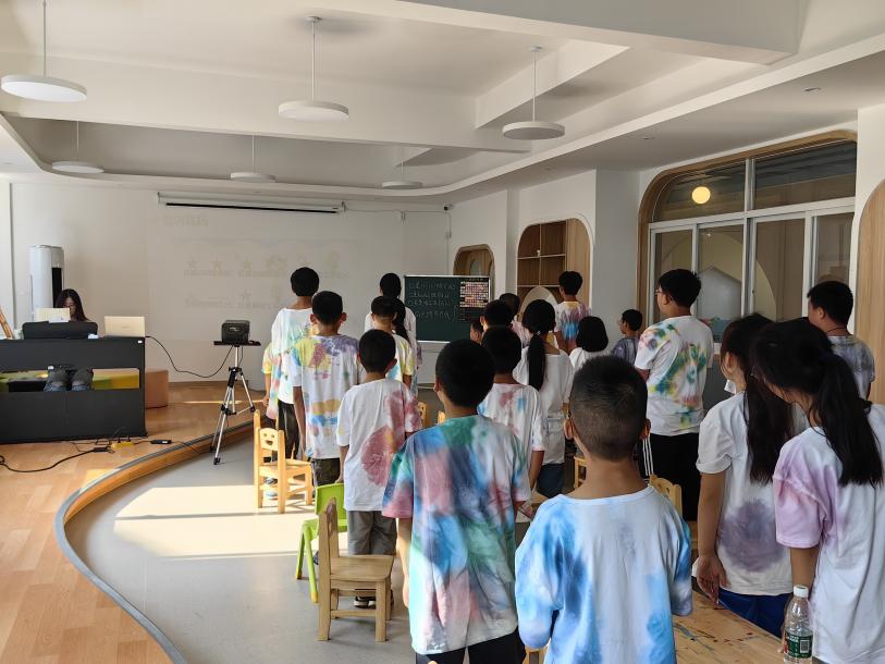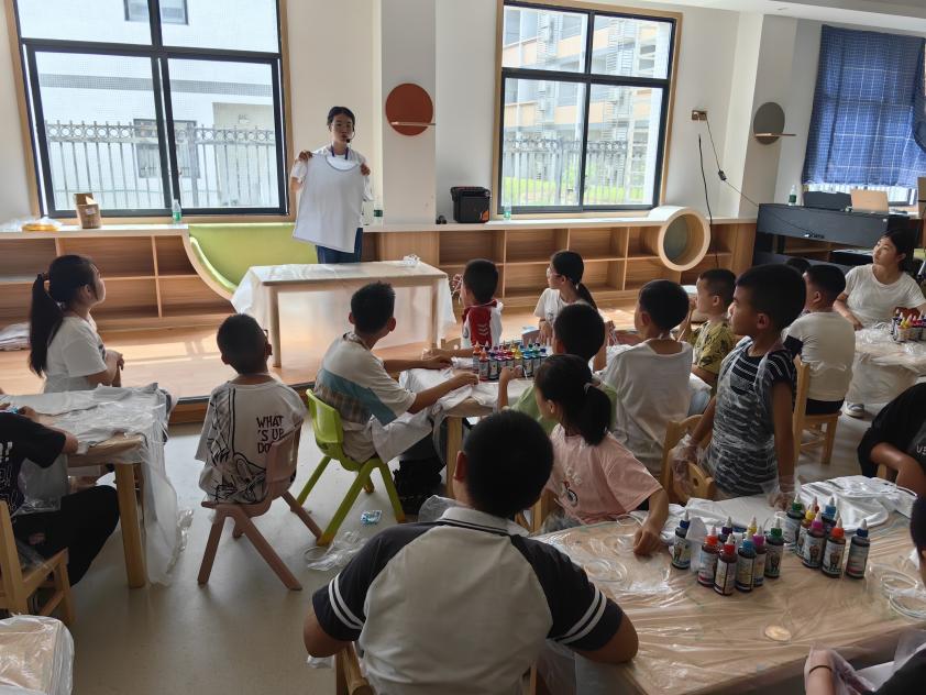 为激发孩子们的创造力和审美情趣,培养他们的艺术素养和人文素养,同时传承红色文化,培育爱国情怀,实践队员们特别设计了《闪闪红星》歌曲传唱与“‘玩’美童年,妙‘布’生花”——扎染艺术体验活动。在悠扬的音乐声中,孩子们感受着艺术的魅力,体悟着深厚的革命情感和爱国主义精神;在扎染的过程中,孩子们感受到了非遗传统文化的深厚底蕴,也体验到了亲手创作的快乐以及成功的喜悦。美育活动不仅丰富了孩子们的暑期生活,更在他们的心中播下了美的种子,让艺术之光在他们的成长道路上熠熠生辉。
