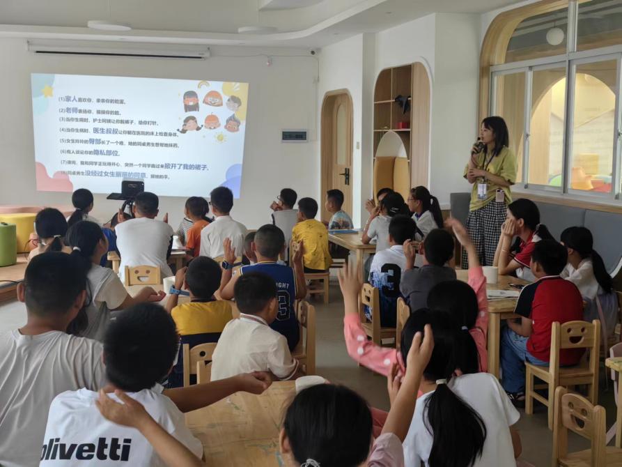 儿童自我保护教育旨在提升困境儿童的自我保护意识和能力,教会他们在面对潜在危险时应如何有效应对,确保他们的身心安全。实践队员们通过“老鹰抓小鸡”游戏、情景剧表演、公约制作、趣味问答等多种形式,将复杂的自我保护知识转化为生动有趣的学习体验。其中,“身体的红绿灯”加深了孩子们对身体隐私部位保护的认识,帮助他们建立了自尊自爱的意识;“对欺凌说‘不’!”让孩子们能够更加深刻地反思校园欺凌的伤害,学会识别欺凌行为,并学会勇于说“不”。活动不仅提高了孩子们的自我保护能力,还促进了他们之间的相互尊重和理解,相信未来孩子们会将所学到的知识应用到日常生活中去,做自己的安全小卫士。