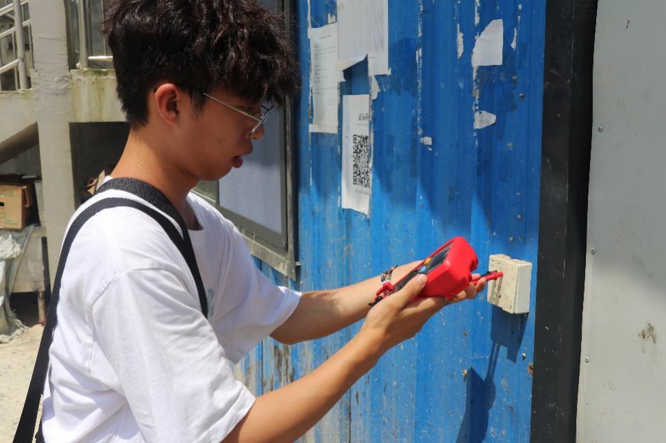 图5:实践队队员陈飞宇辅助检查工厂内电路安全情况