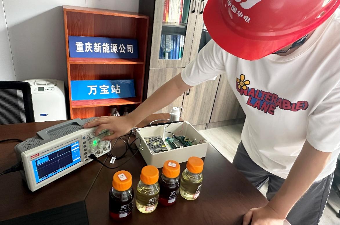 随后,在风电场负责人的带领下,实践队参观了万宝村风电场110kV升压变电站,并对110kv变压器绝缘油进行取样。他们运用便携式能源电力装备超声脉冲回波智能诊断样机对油样进行检测,快速判断出变压器油的老化阶段,为变压器是否停机检修提供可靠依据。