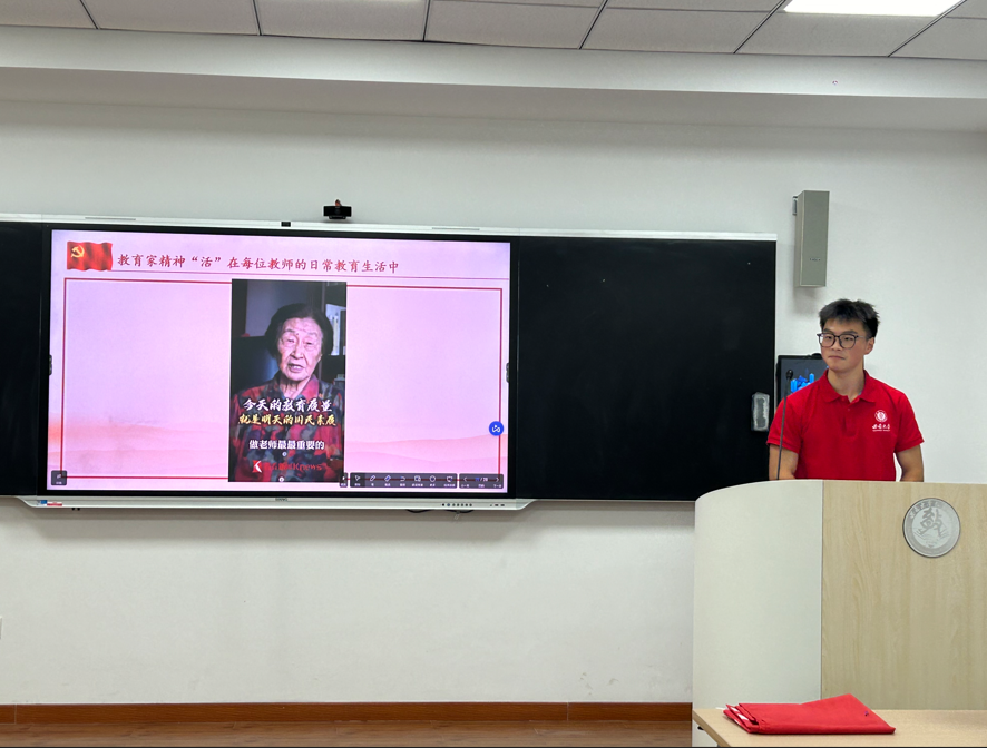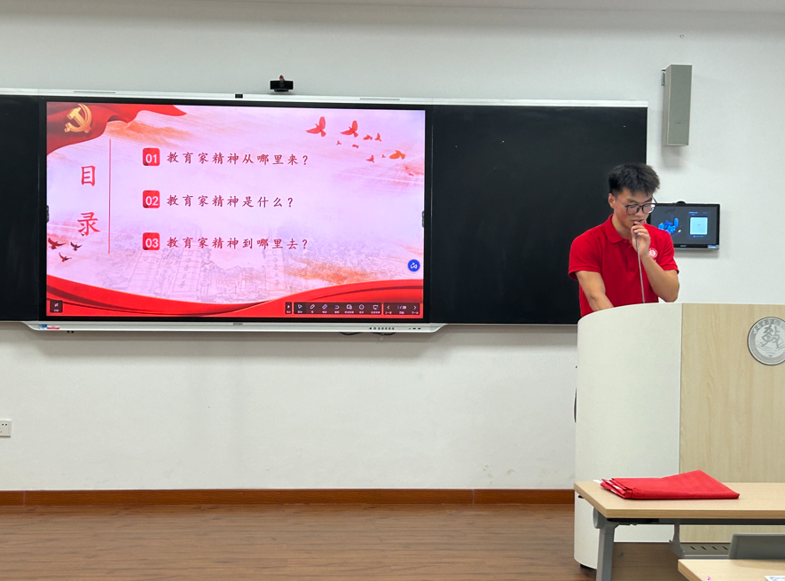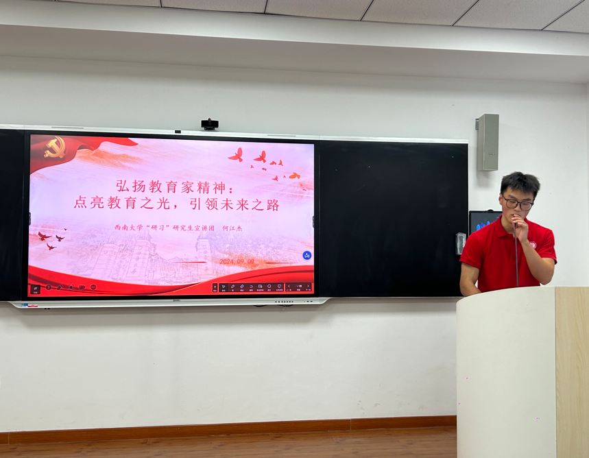 宣讲活动中,betway西汉姆联“研习”研究生宣讲团成员何江杰从“教育家精神从哪里来”“教育家精神是什么”“教育家精神到哪里去”三个维度展开,深析教育家精神,并结合历史案例与个人体验,讲述了我国历史上各教育家们潜心教书育人的感人事迹,生动诠释了教育家精神“活”在每位教师的日常教育生活中。