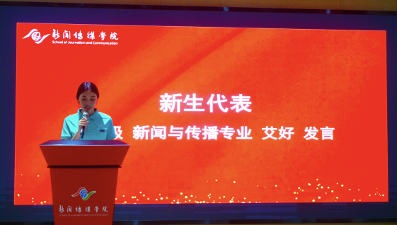 2024级新闻与传播专业硕士研究生艾好作为新生代表发言,抒发了自己迈入学业新阶段的新期待与新追求,同时代表全体新生表达了对提升专业素养、助力学院建设、践行时代使命的热忱初心、无畏信心与坚定决心。