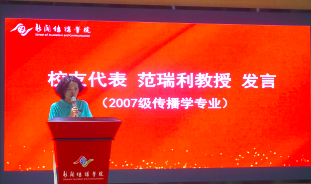 学院特邀校友代表范瑞利教授在大会上将个人的研学生涯娓娓道来,激发了同学们对未来学术道路的思考与期待。作为新闻传媒学院首批硕士毕业生,她勉励新同学们要树立明确目标、珍惜校园时光,在尝试与历练中锻造自我。
