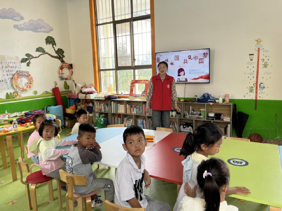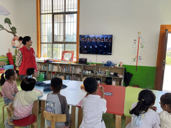 紧接着,志愿者向小朋友们耐心讲解国庆节的历史由来、重要意义以及庆祝方式,并播放了开国大典、国庆阅兵仪式等视频,通过知识科普和视频观看,孩子们对国庆节有了更深入的认识。同时,也激发了他们内心深处对祖国的崇敬与热爱之情。