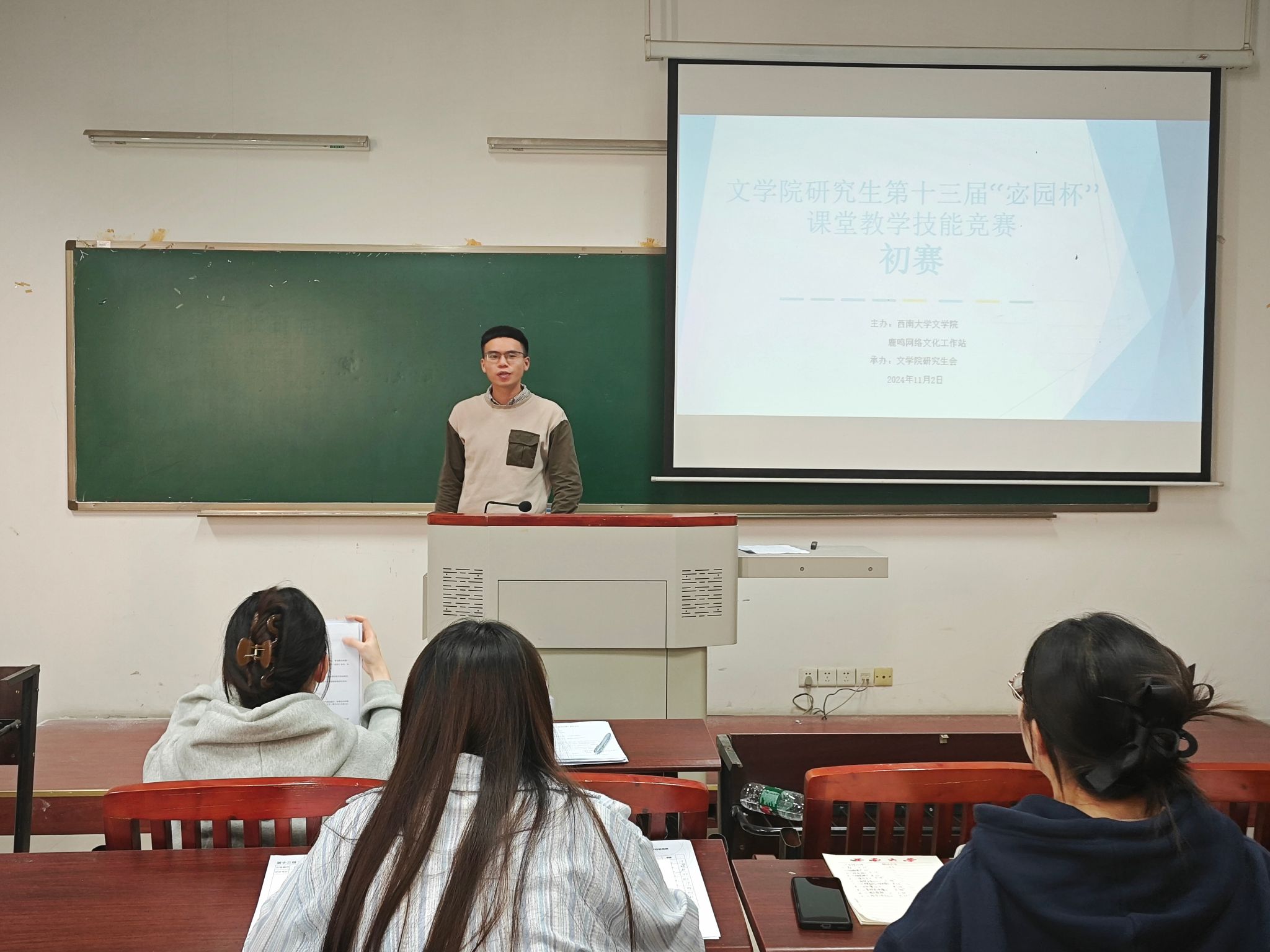 11月2日下午,第十三届“宓园杯”研究生课堂教学技能竞赛初赛在文学院举行。参赛人员共分为三组,分别于111、308、和309教室进行教学展示,不同场地的竞赛同时进行。本次竞赛的参赛选手来自中国古代文学、中国现当代文学、汉语言文学等多个专业,共计35名,评委组由吴妮、衡文熠、陈驰、王雅静等6名往届优秀参赛选手与有着相关经验的研究生构成。