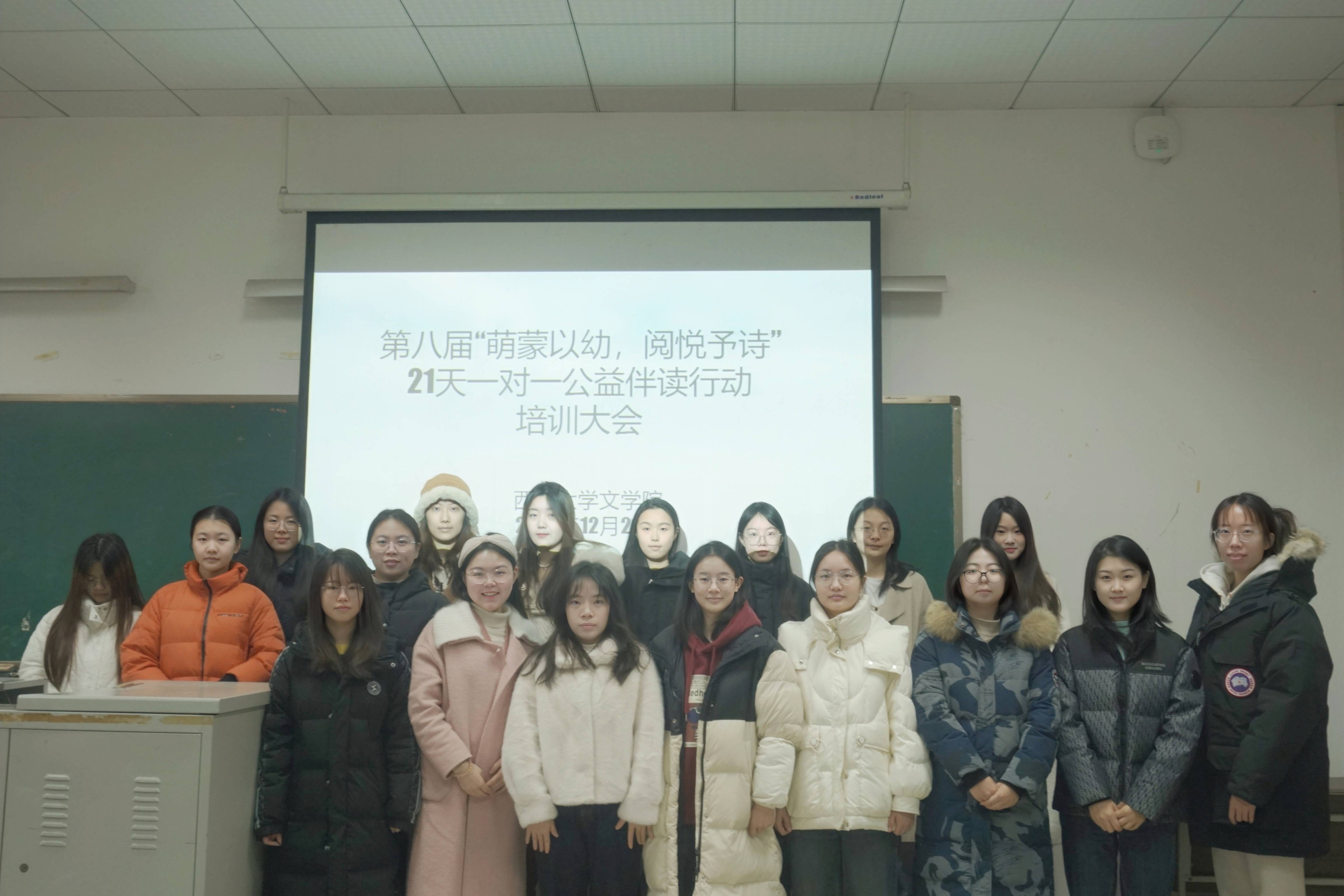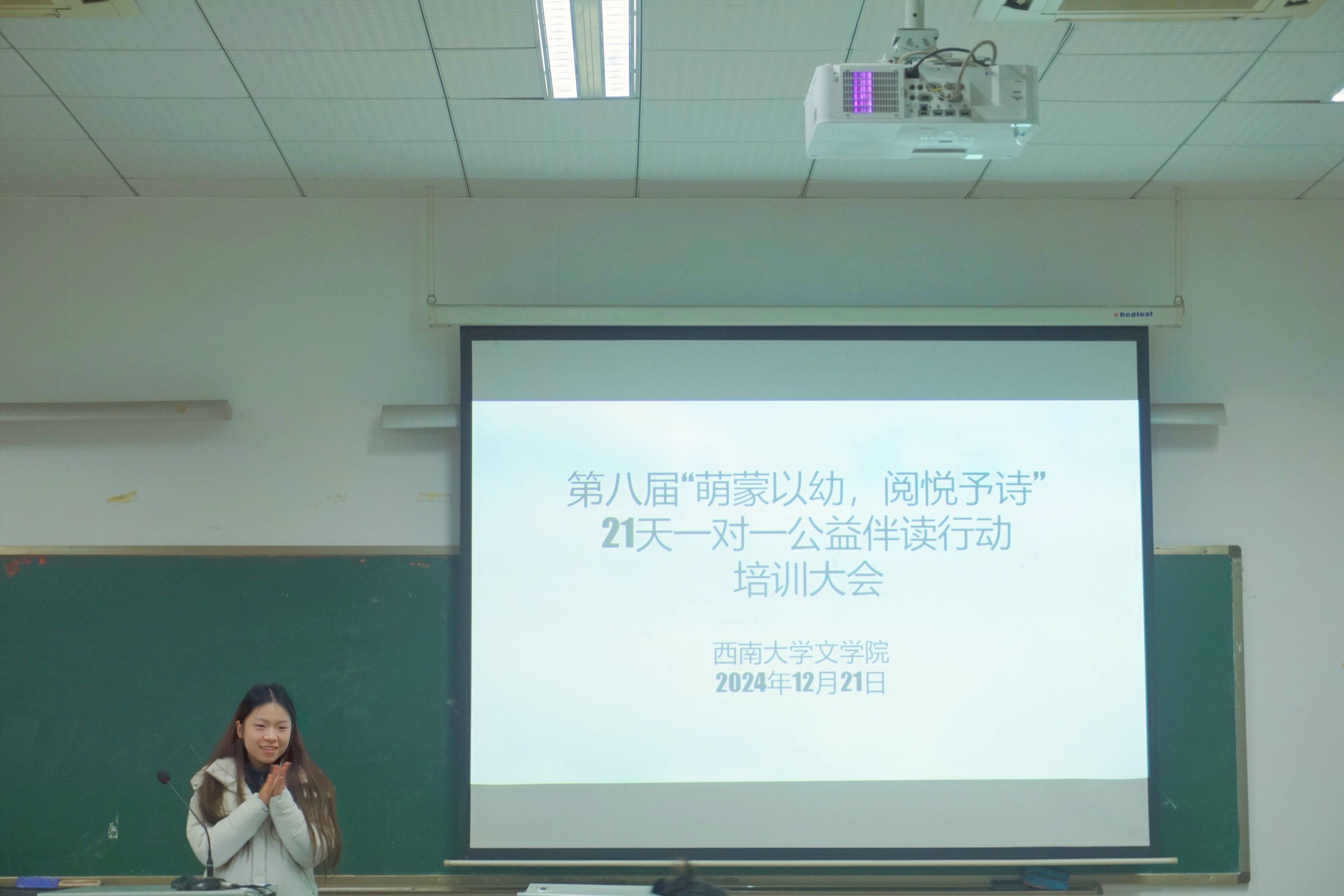 12月21日上午,第八届“萌蒙以幼·阅悦予诗”21天一对一公益伴读行动培训活动在文学院111教室举办。往届伴读行动优秀志愿者徐虹、朱丽梅担任分享嘉宾,由2024级中国现当代文学张暖主持。